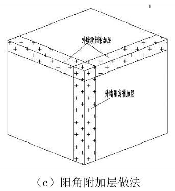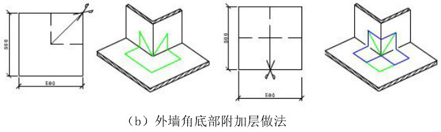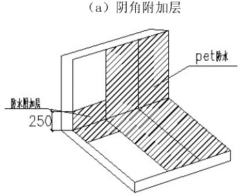 9、防水卷材密封收頭:卷材收口用金屬壓條和鋼釘固定,再用密封膏密封。卷材收口應(yīng)高出室外地坪500 mm。 (三)各節(jié)點(diǎn)做法 1、陰陽(yáng)角附加層做法如下,附加層總寬度為500mm,每側(cè)250mm。